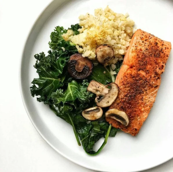 Heat riced cauliflower (can get from traderjoes) on a pan oiled with with Kouzini EVOO. Season with garlic powder, sea salt, pepper and nutritional yeast (nooch), stir then sprinkle more nooch at the end. Pair with salmon {season with turmeric, garlic, paprika, cayenne, sea salt + black pepper + Kouzini cold pressed olive oil. Cook over medium heat} push to side and add remaining veggies, like baby bella, kale, spinach and collard greens + a little bit of coconut aminos! Check out @fitandwellmedgal for more awesome Kouzini recipes!