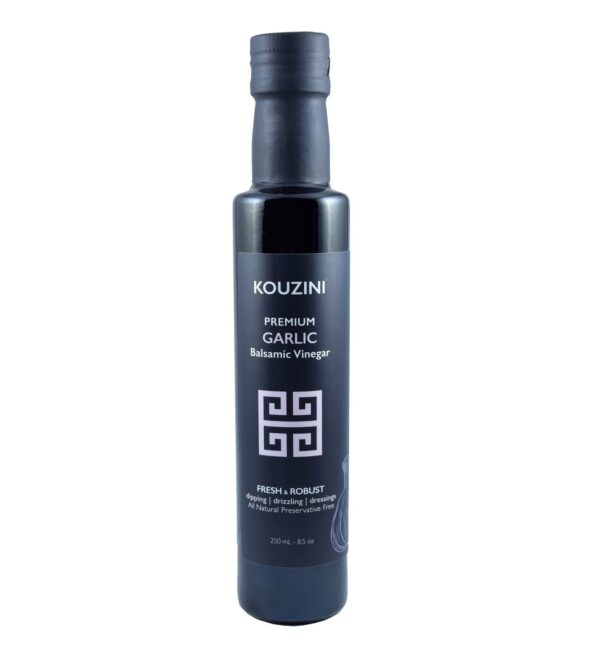 Naturally thick, sweet and delicious. Kouzini Ultra – Premium Garlic balsamic vinegar is perfect for salads, meats, fish, drizzling over pizza and bread dippings. NO artificial colorings, NO added sugars and NO preservatives. This fresh robust vinegar will be perfect for all your creative dishes!